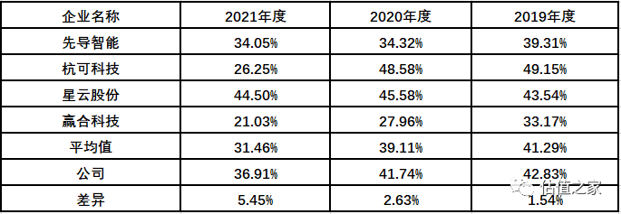 从上表数据可以看出,公司报告期毛利率逐期下滑,2020年相比2019年下降1.09个百分点,2021年同比下降4.83个百分点。我们看同行业上市企业毛利率情况: