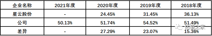 我们可以看到,锂电池充放电检测设备收入占比高,报告期占总收入的比率分别为31.69%、57.68%和48.10%,毛利率一直稳定在50%以上,2019年度最高达54.52%,这个产品星云股份也在生产,如下是二者毛利率的比较: