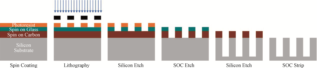 BARC:Bottom Anti-Reflection Coating,底部抗反射涂层;CMP:Chemical Mechanical Polishing,化学机械抛光;TARC:Top Anti-Reflection Coating,顶部抗反射涂层;SOG:Spin on Glass,旋涂硅;SOC:Spin on Carbon,旋涂碳;NTD:Negative Tone Development,负显影。