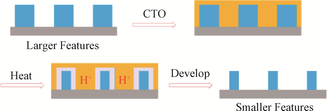 针对线条收缩的代表工艺是Dow Chemical公司的研究人员开发的化学修饰涂层(Chemical Trimming Overcoat, CTO)工艺,如图11所示。该工艺首先利用光刻得到较大尺寸的图形,然后进行CTO涂层处理,在加热条件下,CTO材料产生H+,H+扩散到原图形中引起树脂的脱保护反应,最后经过显影工艺将脱保护的树脂溶解,实现了线条图形的收缩。该工艺可以通过控制CTO处理的温度来控制反应程度,实现对最终图形的尺寸的控制。