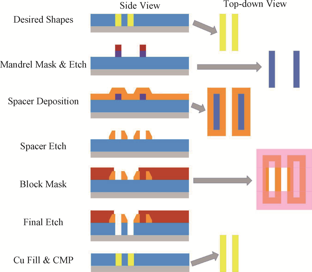 图4给出了SADP工艺示意图。首先作出尺寸较大的辅助图形(Mandrel),然后利用沉积工艺在辅助图形周围形成侧墙(Spacer),实现图形间距的缩小,再利用侧墙作为掩膜实现图形的转移。利用隔离层围绕辅助图形的特点实现了自对准,具有较好的套刻宽容度。工艺过程中只用到一次关键光刻步骤,同时刻蚀次数相对较少,具有工艺简单、成本低的优点。但受限于其本征技术特点,只能用于结构简单的图形,因此最早在存储器工艺中应用,近年来在逻辑制程的金属层中也有应用。