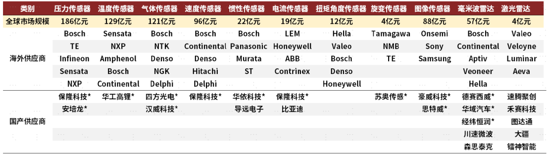 图表:车载传感器整机市场规模(2021年)、主要供应商
