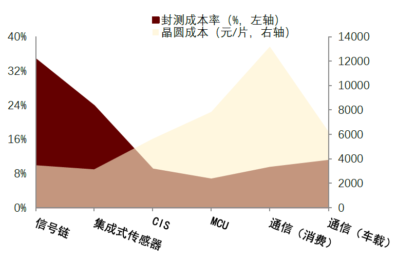 图表:不同类型芯片封测成本和晶圆成本对比