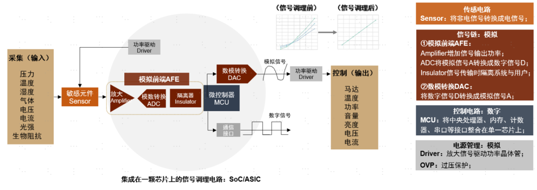 传感器是一个完整的数据采集系统,含模拟和数字电路。传感器的核心是数据采集,即将被测对象的各种参量(物理、化学或生物量)通过各种敏感元件做适当转换之后,再经过信号调理、采样、量化、编码和传输等步骤,最后送到计算机系统进行处理、分析、存储和实现。成套的数据采集系统(Data Acquisition System,DAS),由敏感元件(Sensor)、模拟前端(AFE, Analog Front End )和微控制器(MCU, Microcontroller Unit)等组成,其工作原理是:从Sensor接收到模拟电信号,由AFE通过放大器放大,再由ADC把模拟信号转化为数字信号,经过MCU处理。其中,AFE是信号链的组成部分,一个完整信号链除了信号感知和处理外,还包括由DAC还原为模拟信号的过程。