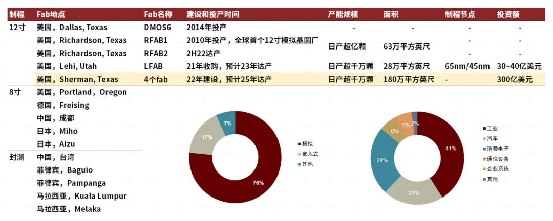 图表:全球模拟芯片龙头德州仪器(TI)主要晶圆、封测产能布局、FY21收入结构拆分