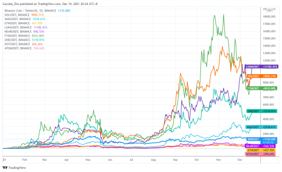 单从收益表现来看,或许新公链才是最大赢家。上图展示了2021 年截至 12 月 19 日以来,主流新公链的收益表现,具体排序为 Terra(Luna、112x)、Solana(SOL、99x)、Fantom(FTM、82x)、Harmony(ONE、50x)、BSC(BNB、13x)、Cosmos(Atom、3x)、Polkadot(DOT、2x)。