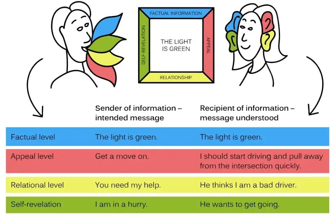 冲突管理:由于团队有着不同背景,冲突难免发生,为了找到一个相互能接受的、平衡的解决方案,架构师需要充当粘合剂,来解决这些冲突。关于沟通的理论,我是从Schulze von Thun的Four-Ears Model开始的: