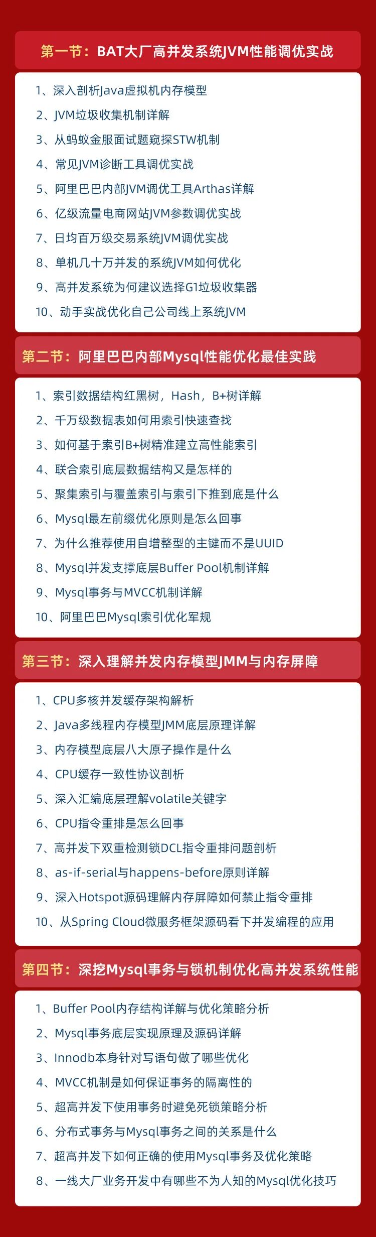 大家可以先看一下这四节课的课程安排,一共38个技术点讲解。各种高并发情况以及性能调优问题一网打尽,实战和项目都是一线大厂级别,掌握了对于大家冲刺大厂也是一份底气!