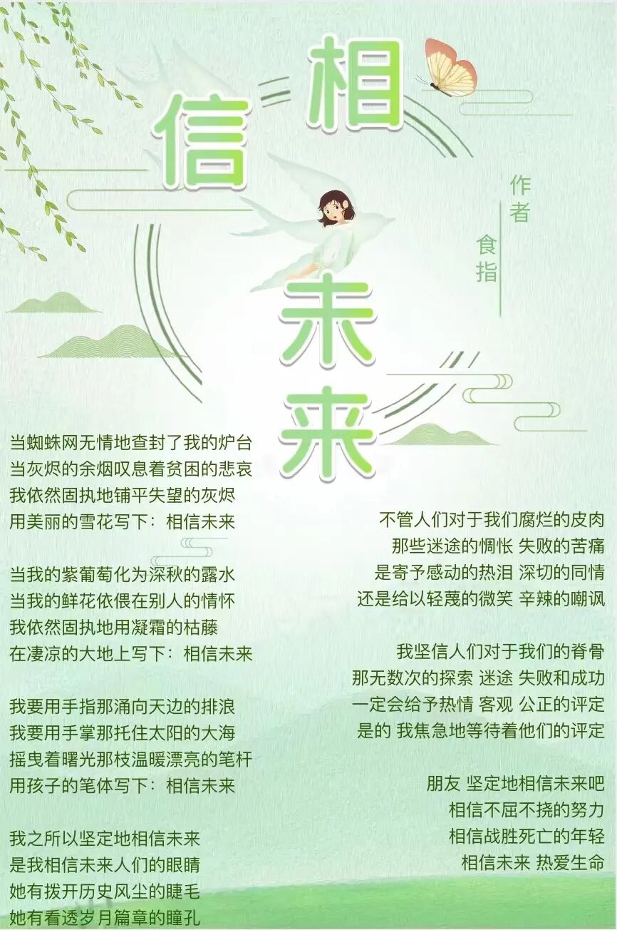 《相信未来》是食指作于1968年的一首朦胧诗。该诗以其深刻的思想、优美的意境、朗朗上口的诗风让人们懂得了在逆境中,怎样好好地生活,怎样自我鼓励,怎样矢志不渝地恪守自己对明天的承诺。这是一个青年的呐喊,一个青年的觉醒,是寄给未来青年的一封信,超越时空,青春的力量依旧蓬勃!