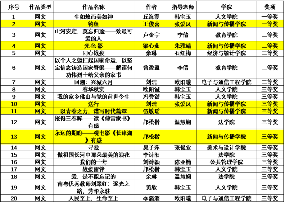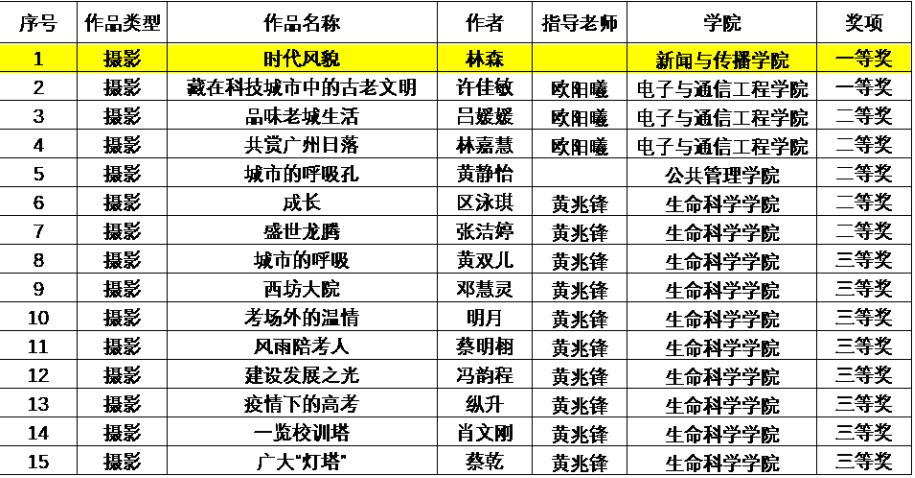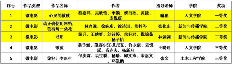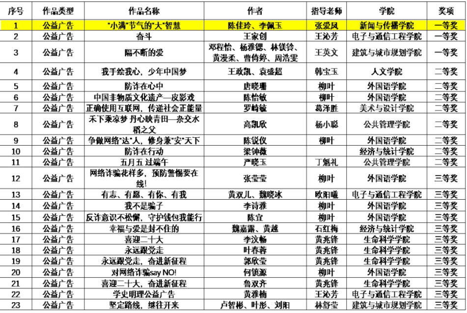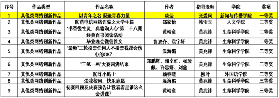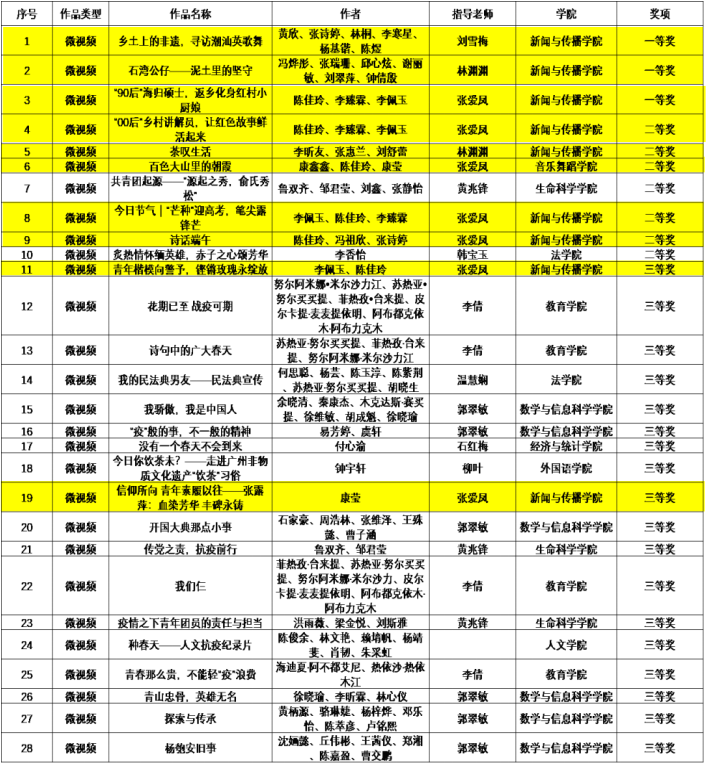 广州大学国家语言文字推广基地工作执行单位新闻与传播学院师生在微视频、微电影、摄影、网文、公益广告、音频、其他类网络创新作品这7个项目中共获得22个奖项。其中,8个作品获得一等奖、8个作品获得二等奖、6个作品获得三等奖。获奖名单如下: