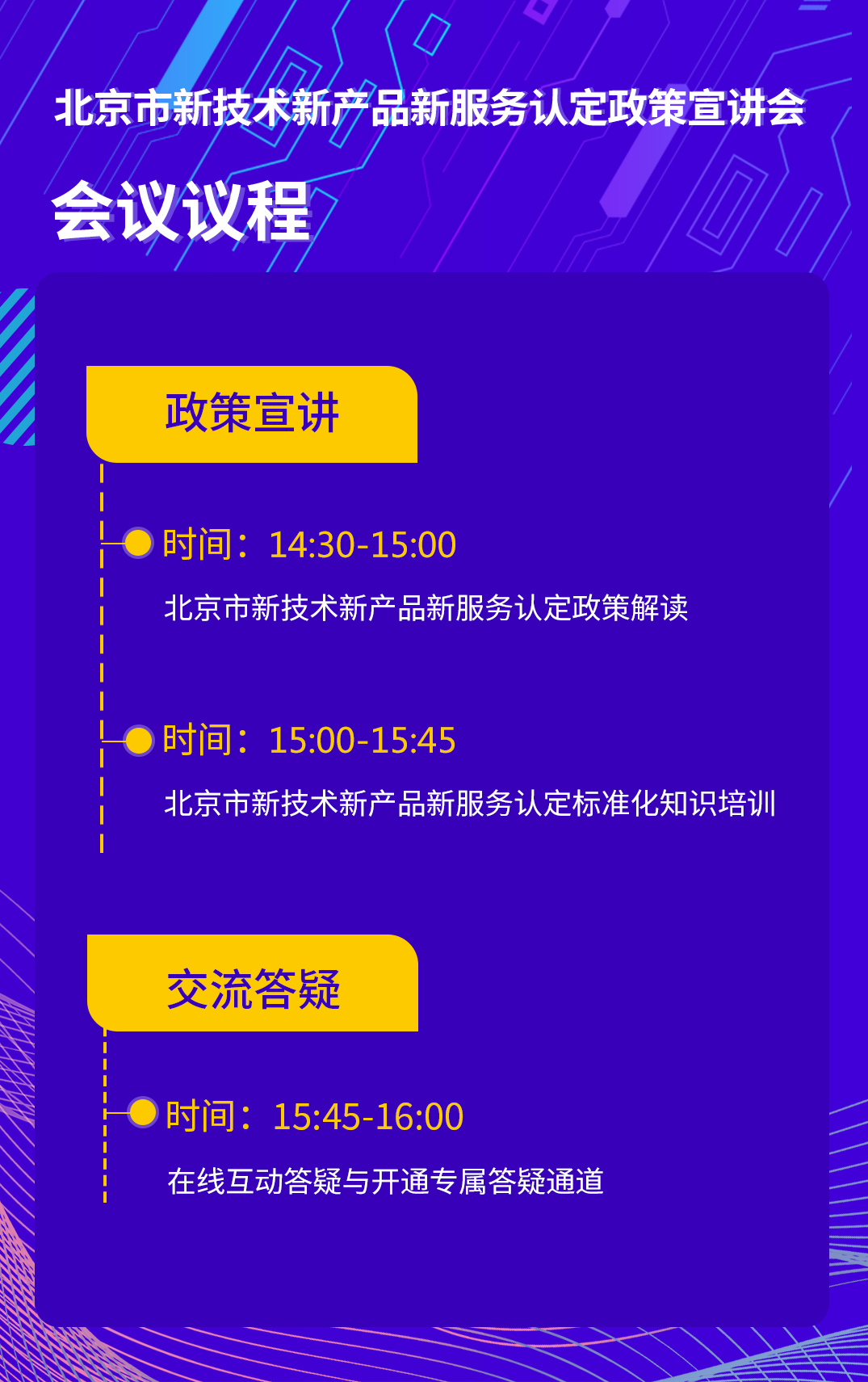 为做好2023年第一批(总第十八批)北京市新技术新产品新服务认定工作,帮助创新主体更好掌握相关政策,定于12月28日(周三)举办北京市新技术新产品新服务认定政策宣讲会,具体安排如下: