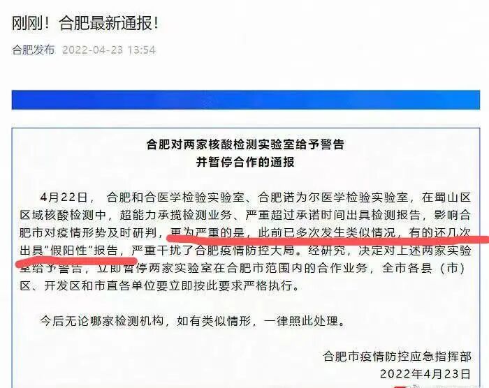 2,更为严重的是,此前已多次发生类似情况,有的还几次出具“假阳性”报告,严重干扰了合肥疫情防控大局。