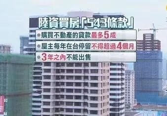 简单来说,这被称为“543门槛”,即:银行贷款额度5成以下、每年赴台总时间为4个月、购得房屋3年内不得专卖。