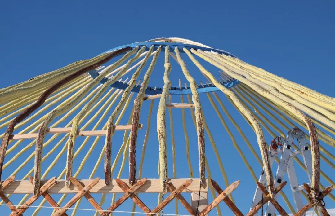 观众还可以亲历撑蒙古包的过程:用牛皮绑起来的围栏“哈那”外面披上几块厚厚的毡子▲
