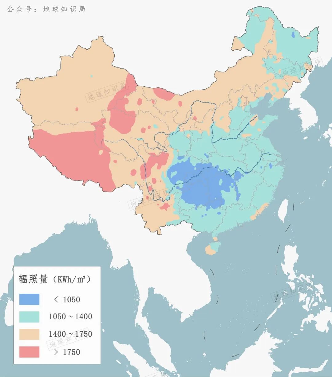 西部地区由于高原多、干燥少雨,太阳能资源也极其丰富,比较全国各地的总辐射照量,西北尤其是高原地带是辐射照量最大的。相比之下,自宜宾以下的长江流域,太阳能资源就少很多。