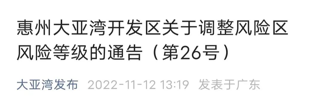 根据当前我区疫情防控工作需要,按照国务院应对新型冠状病毒肺炎疫情联防联控机制综合组《关于进一步优化新冠肺炎疫情防控措施 科学精准做好防控工作的通知》(联防联控机制综发〔2022〕101号)相关规定,经专家组研判,大亚湾区新冠肺炎疫情防控工作领导小组(指挥部)办公室决定对惠州大亚湾开发区风险区域进行调整,现将相关事项通告如下: