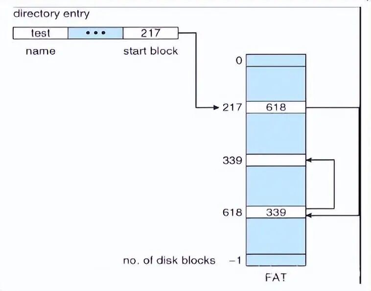 每个文件是磁盘块儿的链表,磁盘块分布在磁盘的任何地方,文件有起始块和结束块来定义