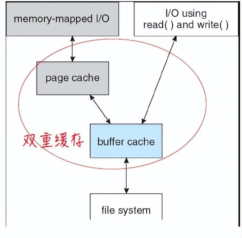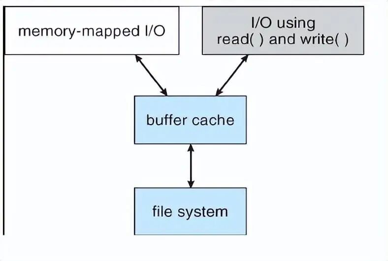 系统调用read()和write()会通过缓冲区缓存,然而,内存映射调用需要使用两个缓存,即页面缓存和缓冲区缓存。内存映射先从文件系统中读入磁盘块,并放入缓冲区缓存,由于虚拟内存系统没有缓冲区缓存接口,缓冲缓存内的文件必须复制到页面缓存中。