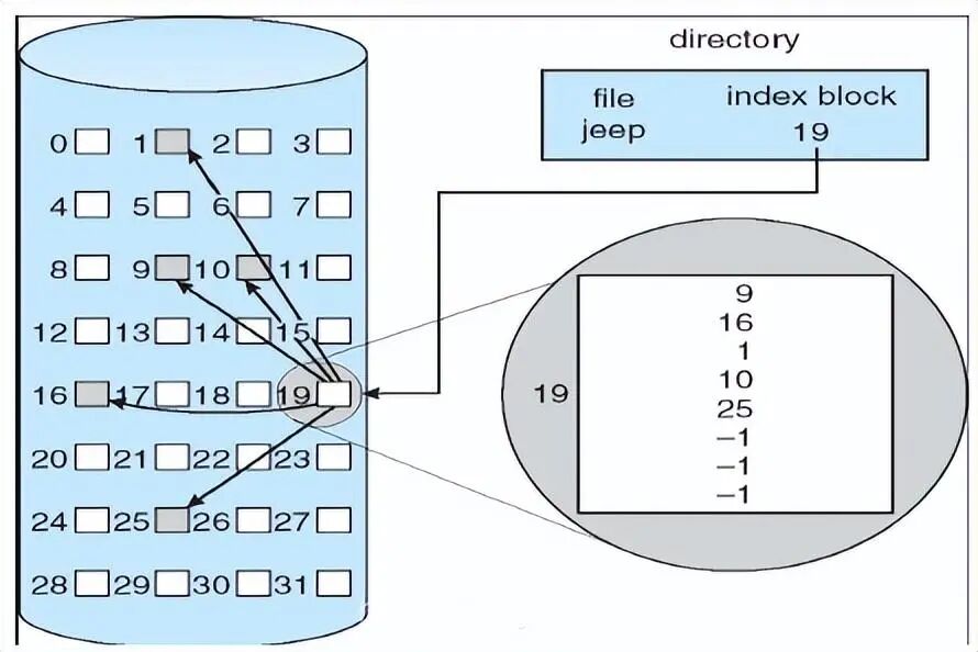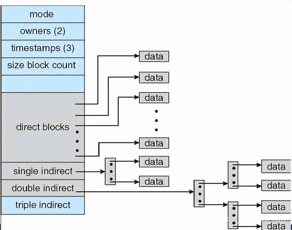 组合方案:用于基于UNIX的文件系统,将索引块的前15个指针存储在文件的i-node中。其中,前12个指针指向直接块,剩下3个指针指向间接块