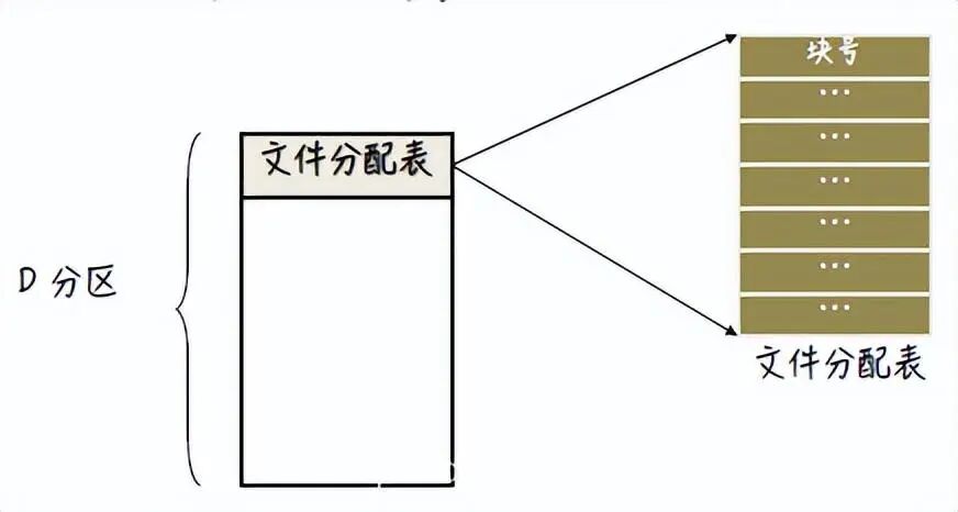 每个卷的开始部分用于存储文件分配表(File Allocation Table),表中每个磁盘块都有一个FAT条目,并可通过块号索引。(未使用的块为0,使用的块包含下一个块儿号)
