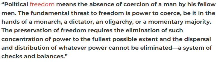 “政治自由意味着一个人不受其同胞的胁迫。对自由的根本威胁是强制性的权力,无论这种权力是掌握在君主、独裁者、寡头还是暂时多数者的手中。为了维护自由,就必须尽可能地消除这种权力集中的现象,就必须分散和分配任何不能消除掉的权力,形成一种相互牵制和平衡的体系。”