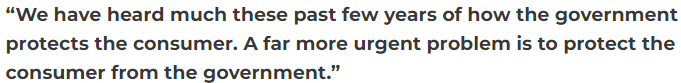 “过去几年里,我们听到了很多关于政府如何保护消费者的言论。一个更为紧迫的问题是保护消费者免受政府的伤害。”
