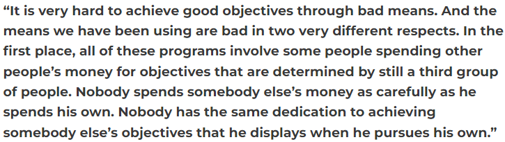 “通过坏手段实现好目标是非常困难的。而我们一直在使用的手段,在两个非常不同的方面是不好的。首先,所有这些项目都涉及到一些人花别人的钱,而这些目标是由第三组人决定的。没有人花别人的钱会像花自己的钱一样谨慎。没有人对实现别人的目标也会像追求自己的目标一样具有奉献精神。”