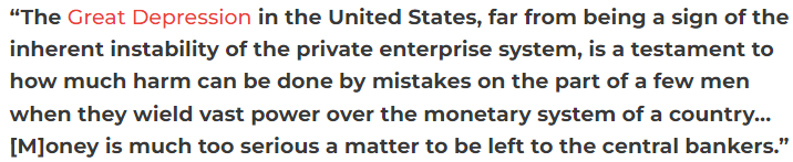“美国大萧条,决不是私营企业体系内在不稳定性的标志,而是证明了,当少数人对一国货币体系拥有巨大权力时,他们的错误会造成多大伤害(…)货币问题太重要了,故不能将货币交给中央银行的银行家。”