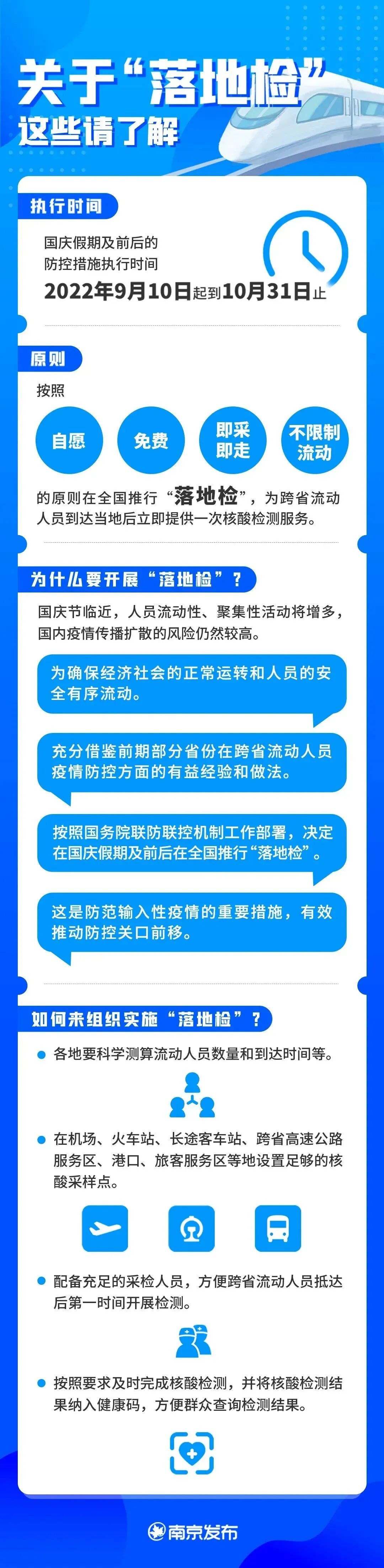 据国务院联防联控机制9月8日新闻发布会,为确保国庆前后不发生本土规模性疫情,2022年9月10日至10月底期间,在全面落实第九版防控方案的基础上,按照“自愿、免费、即采即走、不限制流动”的原则在全国推行“落地检”,这是防范输入性疫情的重要措施,有效推动防控关口前移。国家卫生健康委疾控局副局长吴良有在新闻发布会上表示,“落地检”是指,跨省流动人员抵达目的地后,立即为其提供一次核酸检测服务。吴良有介绍,各地要科学测算流动人员数量和到达时间等,在机场、火车站、长途客车站、跨省高速公路服务区、港口、旅客服务区等地设置足够的核酸采样点,配备充足的采检人员,方便跨省流动人员抵达后第一时间开展检测。按照要求及时完成核酸检测,并将核酸检测结果纳入健康码,方便群众查询检测结果。![]()