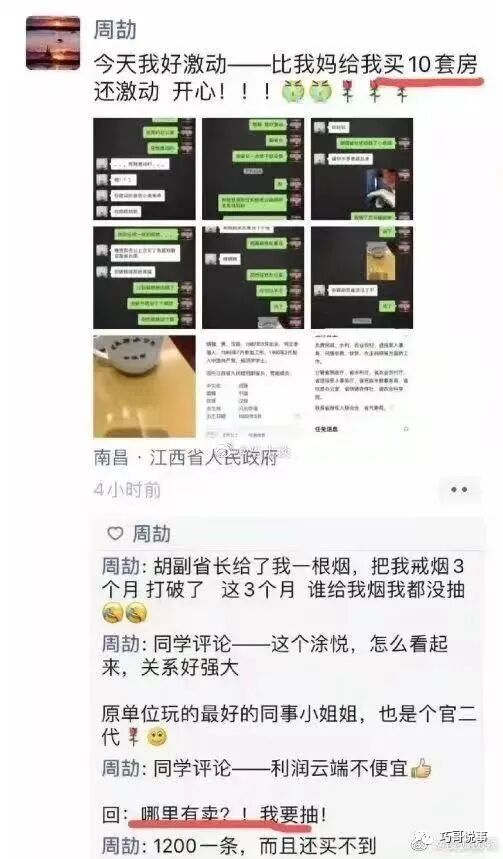 周少爷是在朋友圈发的,你以为是巧哥的朋友圈,谁都可以加?对于这样的官二代少爷,加他是有门槛的,进圈的人也是过滤的,也就是说他朋友圈的人都是信得过的人或哥们,他在这里炫是带着目的。