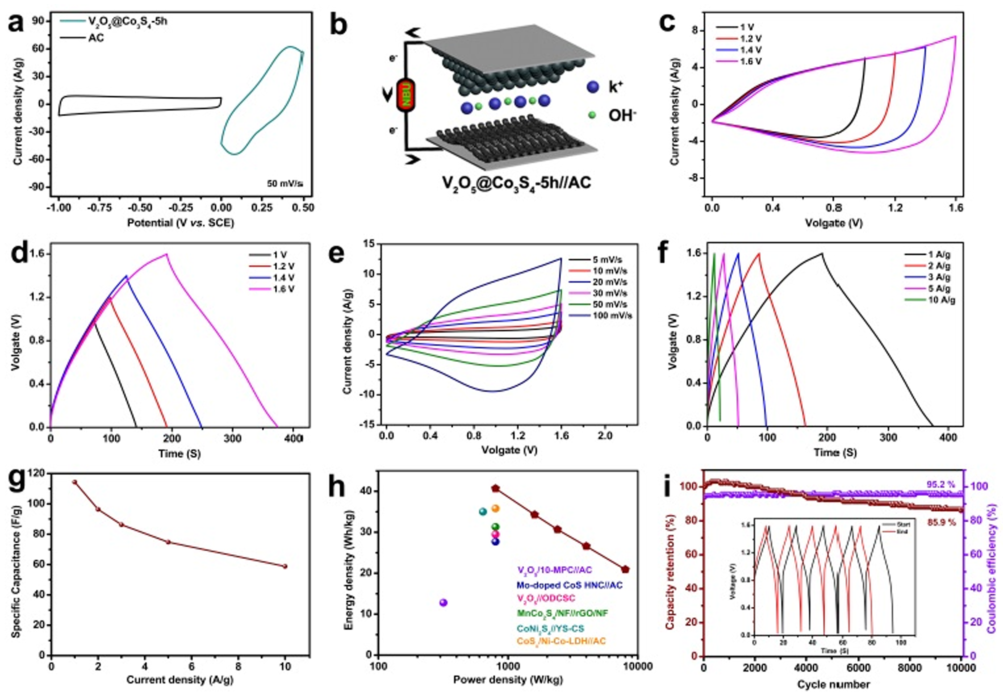 非对称超级电容器由V2O5@Co3S4-5h表现出高能量密度(800 W/kg时为40.7 Wh/kg),具有出色的循环耐久性,10000次循环后保持85.9%的初始电容。