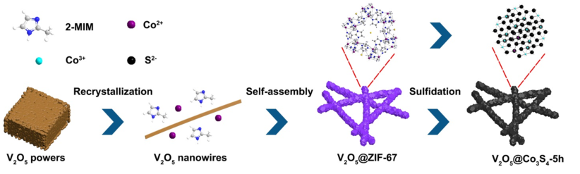 陶课题组使用一维V2O5纳米线作为柔性骨架,将MOF衍生的空心Co3S4三维纳米多面体串起来,以构建坚固的核壳1D@3D V2O5@Co3S4纳米复合材料,其制备过程如图1所示。