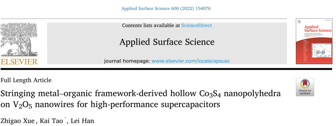 在V2O5纳米线上串接金属有机骨架衍生的空心Co3S4纳米多面体,用于高性能超级电容器