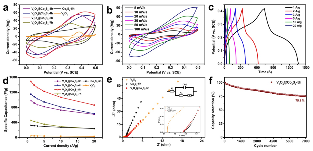 作者对制备得到的电极材料进行储能性能测试,如图4所示。在所有电极材料中V2O5@Co3S4-5h显示CV曲线的最大积分面积,表明其电容最高。其显示出显著的氧化还原峰,暗示存在氧化还原反应。