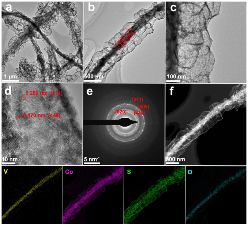 图3V2O5@Co3S4-5h的结构表征:(a-c)TEM图像,(d)HTEM图像,(e)SAED模式,(g)STEM和(h)元素映射,用于模型的V、Co、O和S。
