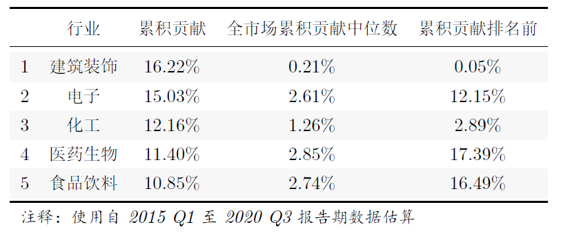 在这样的配置规则与相应的优势行业下,综合起来,为孙文龙的职业生涯带来累积回报(非绝对金额)最高的五个行业如下图所示,收益来源均衡,且均自于他高胜率高的行业。不难看出,他坚守了自己的能力圈,在他深耕最久的建筑装饰和电子上赚到了最多的钱。同时他较为完善的组合构建体系,比如对于景气度的重视、以及基于ROIC的筛选,也让他并没有错过医药生物或食品饮料这样近年来景气的行业。