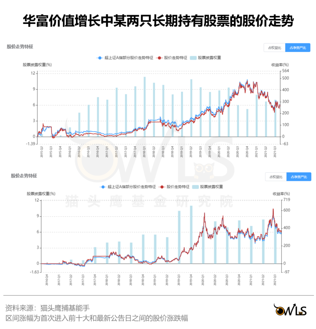 在华富价值增长的最新持仓中,有7只个股的重仓持有时间超过1年。持有时间最长的某药店龙头,已经在前十大中出现22个季度。常年保持5%以上的权重,区间涨幅263.42%;