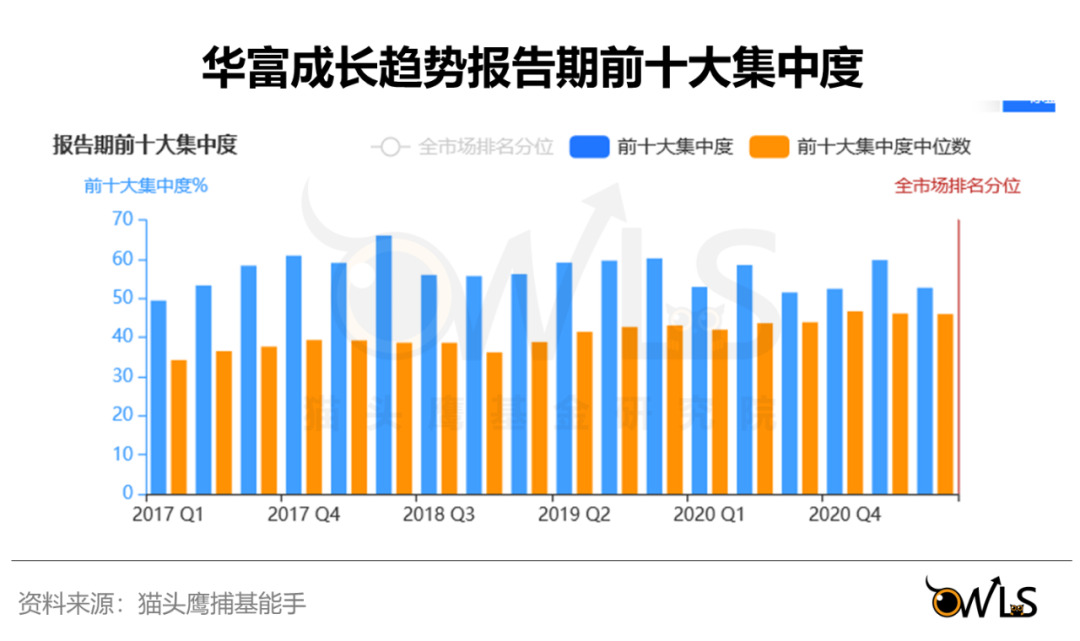陈启明的前十大集中度在50%~60%之间,尽管长期高于市场平均,但适度集中不极致。