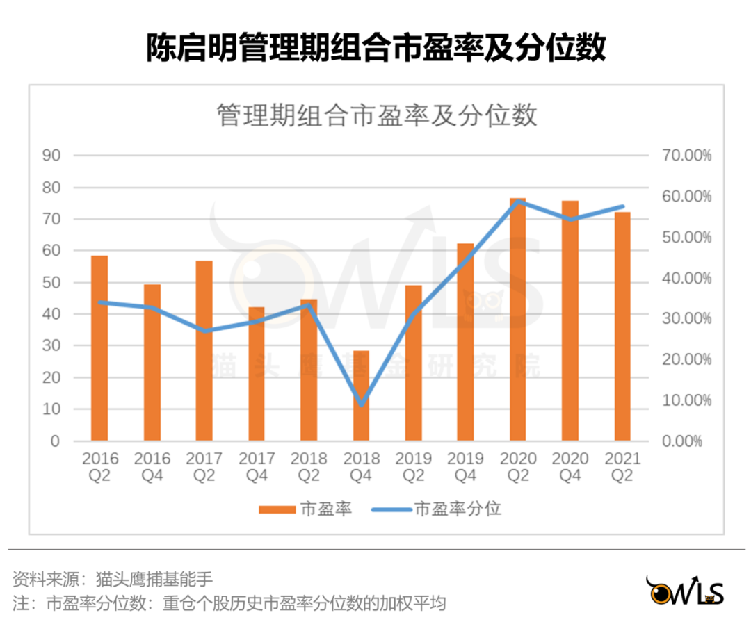 而陈启明有着类GARP的思考方式,会通过历史估值中枢、PEG等来判断公司的合理估值。从组合上看到,即便是近两年他所偏好的科技创新赛道有不断的估值提升,他的组合平均市盈率通常不超过75倍,在历史分位数的60%以下。