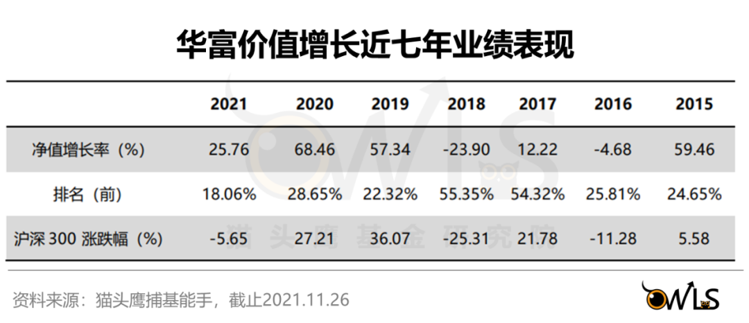 管理时间最久的华富价值增长,年化回报23.89%。在2021年震荡多变、板块轮动频繁的市场,也同样取得了25.76%的成绩。