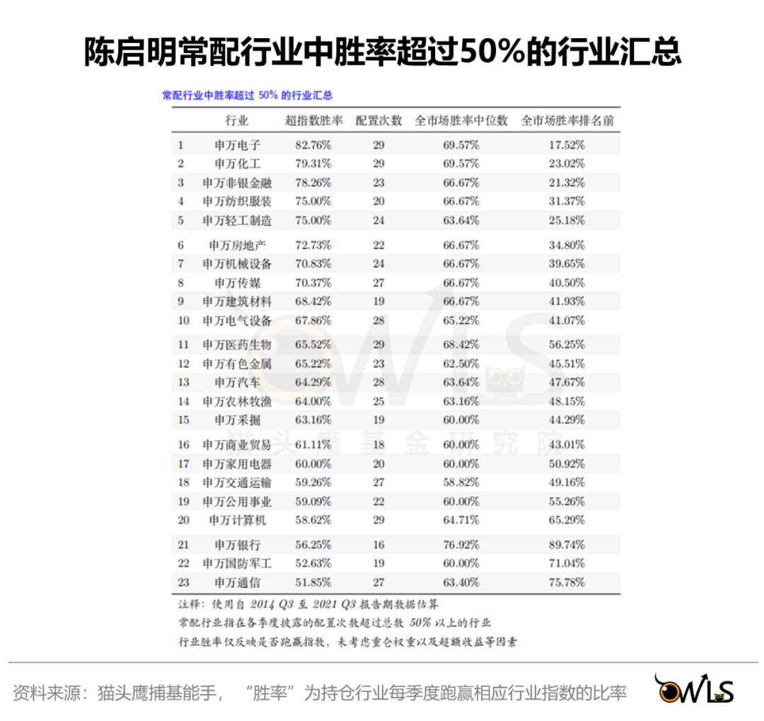 较广的行业宽度,也为他的“中观选赛道,自下而上选股“的方法论,提供了底层支撑。从数据上可以看到,在23个常配的申万一级行业上,都表现出了稳定的超行业指数胜率。