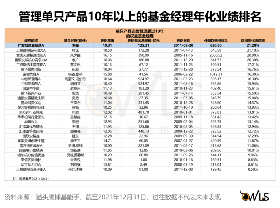 截至2021年底,在偏股与混合领域,执掌同一只基金产品超过10年的基金经理一共有27位,其中,广发基金李巍的“广发制造业精选混合”,自2011年9月成立至2021年底之间总收益达到630.60%,以21.28%的年化收益位列第一。