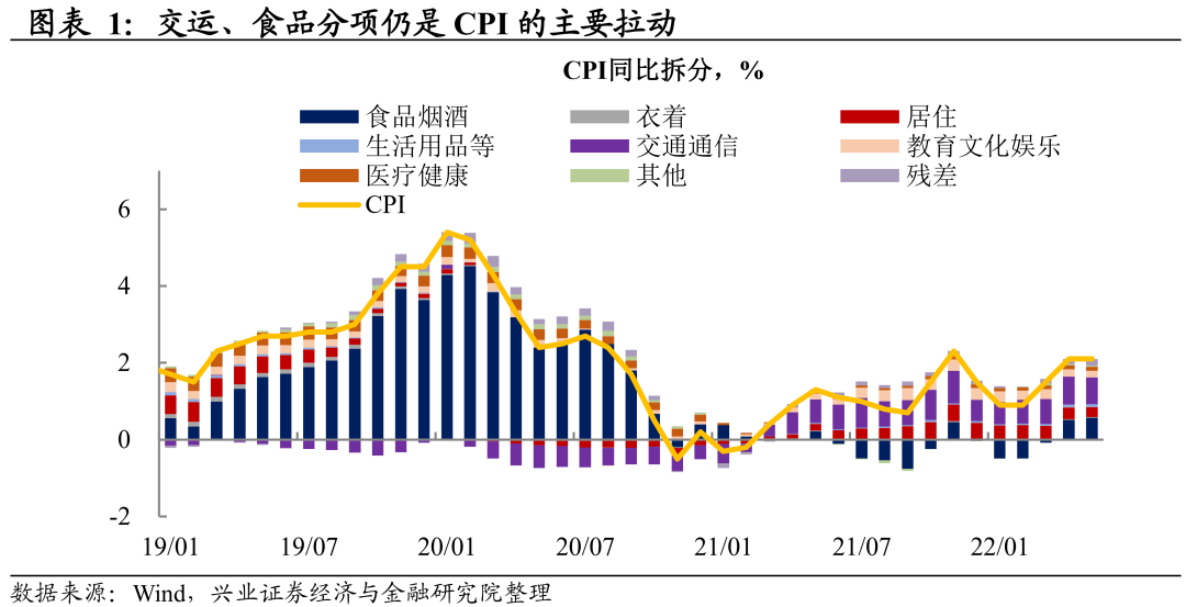 CPI各分项情况与上期基本类似,交运、食品分项是主要拉动。2022年5月CPI同比上涨2.1%,与前值持平,略低于预期值的2.2%。分项来看,交通通信、食品烟酒、居住、教育文化娱乐分别拉动0.69、0.57、0.26、0.17个百分点,整体格局与上期基本一致,交运和食品分项是主要拉动。