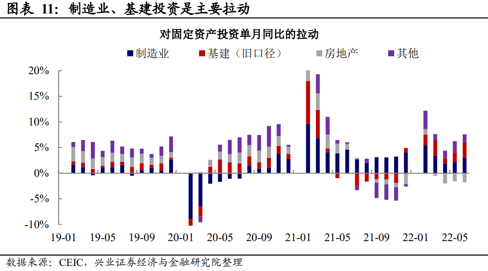 稳增长背景下,基建、制造业投资的拉动有所扩大。6月固定资产投资增速为5.8%,较前值的4.7%有所上行。分项来看,6月制造业投资、基建投资、房地产投资同比增速分别为9.9%、12%、-9%,而5月制造业投资、基建投资、房地产投资同比增速分别为7.0%、7.9%、-7.8%,基建、制造业投资的拉动有所扩大。本轮疫情下,“稳增长”政策出台,包括国务院会议部署33项稳增长措施及督促地方政府尽快落实等,当前基建投资仍在持续发力。