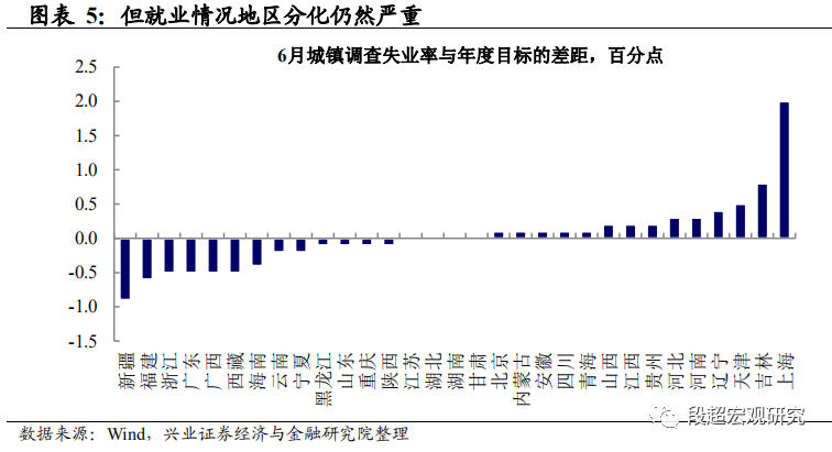 此外,就业也在二季度经历砸坑后的反弹,但当前地区分化仍然较大。2022年4至6月,城镇调查失业率由6.1%降至5.5%,已经回到了本轮疫情之前2022年2月的水平。同时,由于本轮疫情主要影响大城市,我们看到4-5月大城市失业率与全国城镇失业率走势分化,大城市失业率大幅高于全国整体失业率,但这一现象在6月有明显改善,大城市失业率快速回落。值得注意的是,当前各地区的就业情况分化仍然较大,例如上海、吉林6月城镇调查失业率分别为7%、6.8%,较年度目标值分别高2个百分点、0.8个百分点,而福建、浙江6月城镇调查失业率分别为4.9%、5%,较年度目标值分别低0.6个百分点、0.5个百分点。