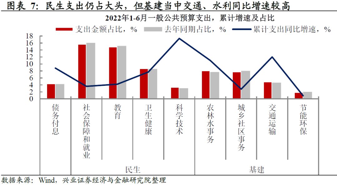 支出端:债务付息拉动下降,民生、基建拉动双增。6月全国一般公共财政支出同比增长6.1%,民生类支出拉动2.9个百分点(前值1.2个百分点),基建类支出拉动2.3个百分点(前值1.3个百分点)。基建内部,农林水、交运支出增速相对较高,分别为11%、12%,这也与今年水利、交通为稳增长重要抓手一致。