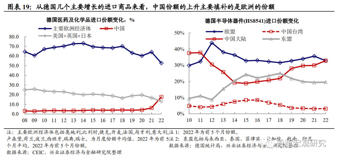 而从份额来看,中国主要填补的是欧洲的份额。细看几个主要增长的品类,尽管历史表现不一,但2022年均出现份额的增长,同时都基本对应着德国从欧洲内部的进口份额下降。值得注意的是,东盟与中国的份额是共同上升的(或者中国上升,东盟走平),印证前面所述,中国与东盟更像是合作关系,而非竞争关系。