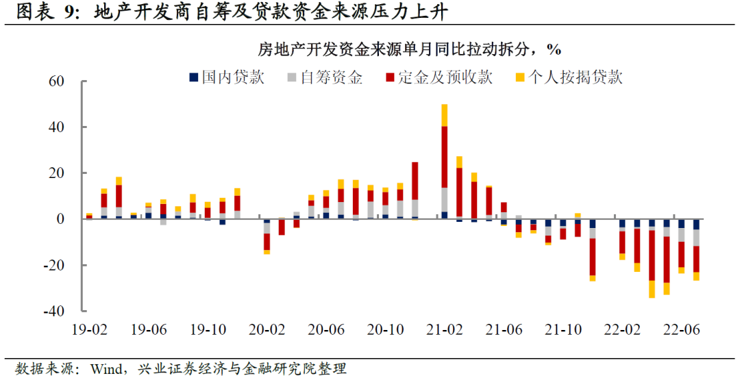 房地产依然疲弱,修复势头进一步放缓。从地产销售端来看,商品房成交面积在经历了5-6月的疫后填坑之后,7月地产销售开始出现明显的拐头向下,并在8月初进一步下滑,当前已明显低于2020-2021的季节性水平。而从开发商融资端来看,在地产销售预期走弱的背景下,7月地产商自筹和贷款资金的同比降幅扩大,其资金来源压力进一步上升。整体而言,当前地产开发商面临来自销售端和融资端的双重挤压,这意味着其现金流仍然面临较大压力。而这也解释了为何7月开发商建筑工程投资走弱非常明显,地产开发投资降幅进一步扩大。