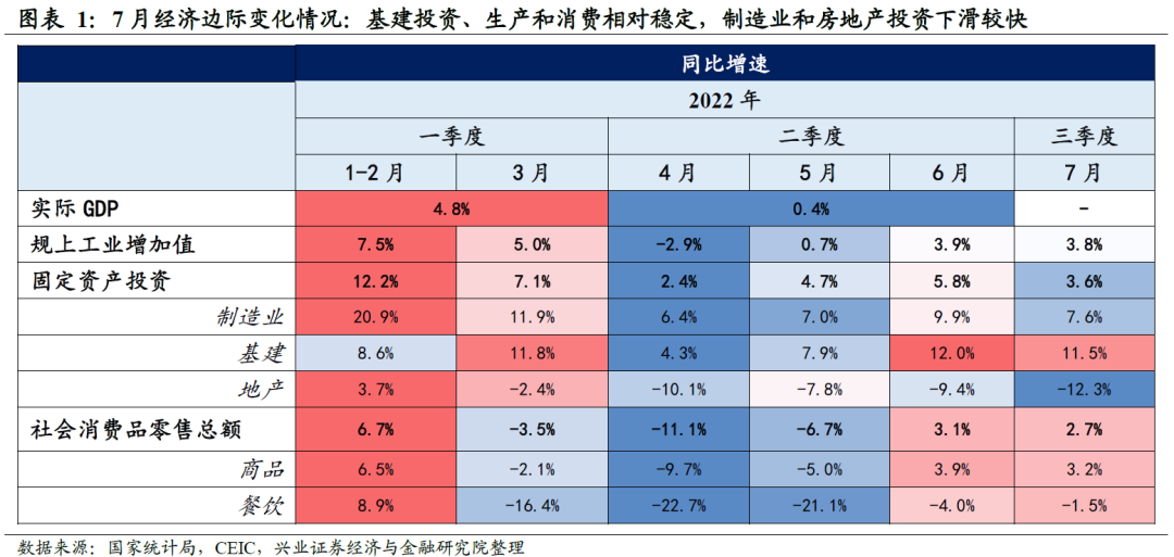 2022年7月规模以上工业增加值同比3.8%;固定资产投资同比3.6%;社会消费品零售同比2.7%,我们认为:
