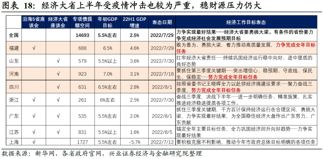 地方稳财源压力也较大,财政政策或需加快落地。今年经济大省也明显受到疫情冲击,上半年实际GDP增速和年初增速目标差距较大,近期疫情和高温限电限产又对生产生活秩序造成新的扰动,稳财源压力仍然较大。政治局会议要求“财政货币政策要有效弥补社会需求不足”,货币政策已在长短端同时超预期降息10BP,前期布置的财政政策或也将进一步显效。